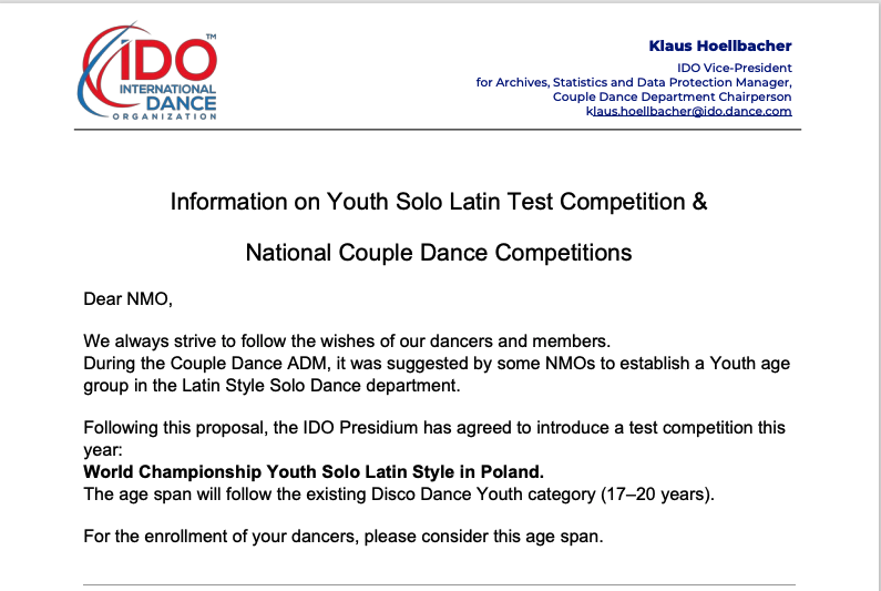 Quota di iscrizione 80,00 chf per ballerino. Si prega di notare che questo importo può variare a seconda delle informazioni fornite dalla Federazione Internazionale e/o dall’organizzatore. L’importo deve essere versato al momento dell’iscrizione - Si prega di comunicare a Françoise Budry la data e l’ora di arrivo e di partenza, nonché l’indirizzo dell’albergo